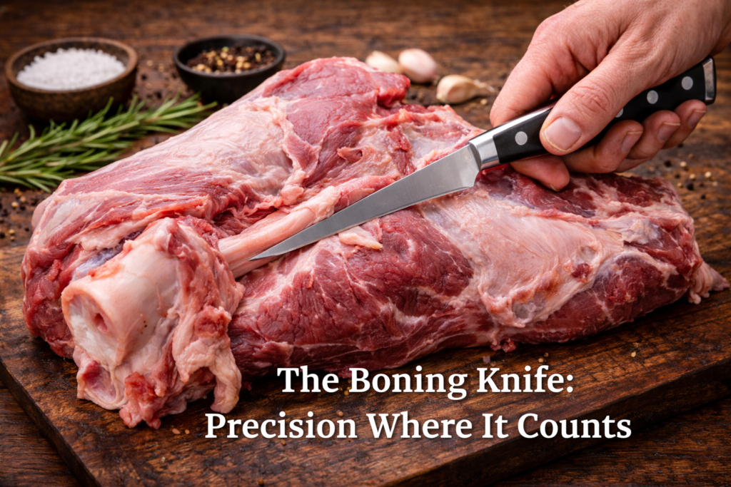 This is the knife that separates casual cooks from confident ones. Because it has a narrow, flexible blade, a boning knife gives you control without tearing meat fibers—especially when breaking down whole cuts.
