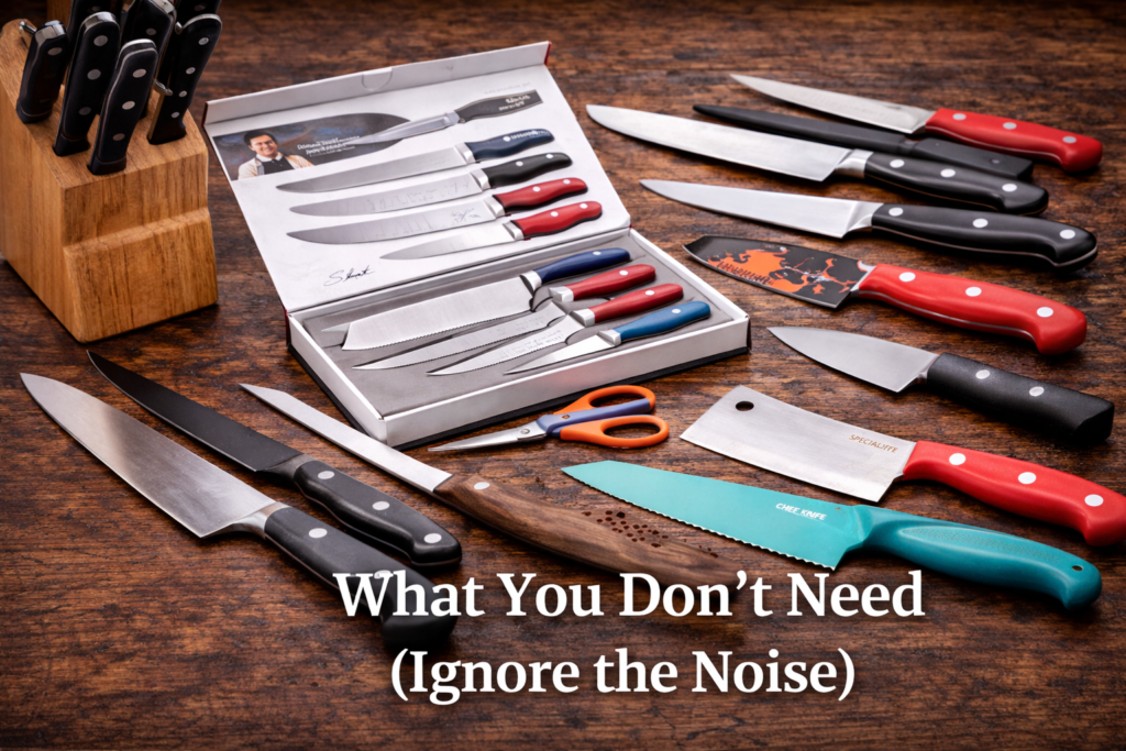 What You Don’t Need (Ignore the Noise) You can safely skip oversized knife sets, celebrity chef branding, specialty “meat knives,” or coated novelty blades. Ultimately, a few quality knives outperform a cluttered drawer every time.