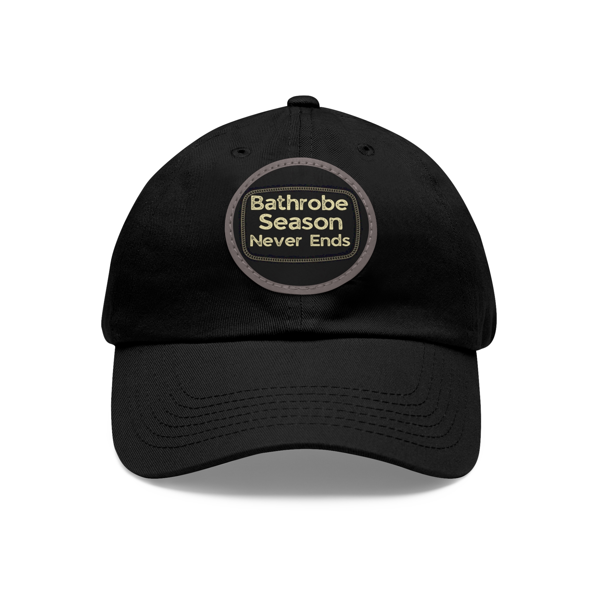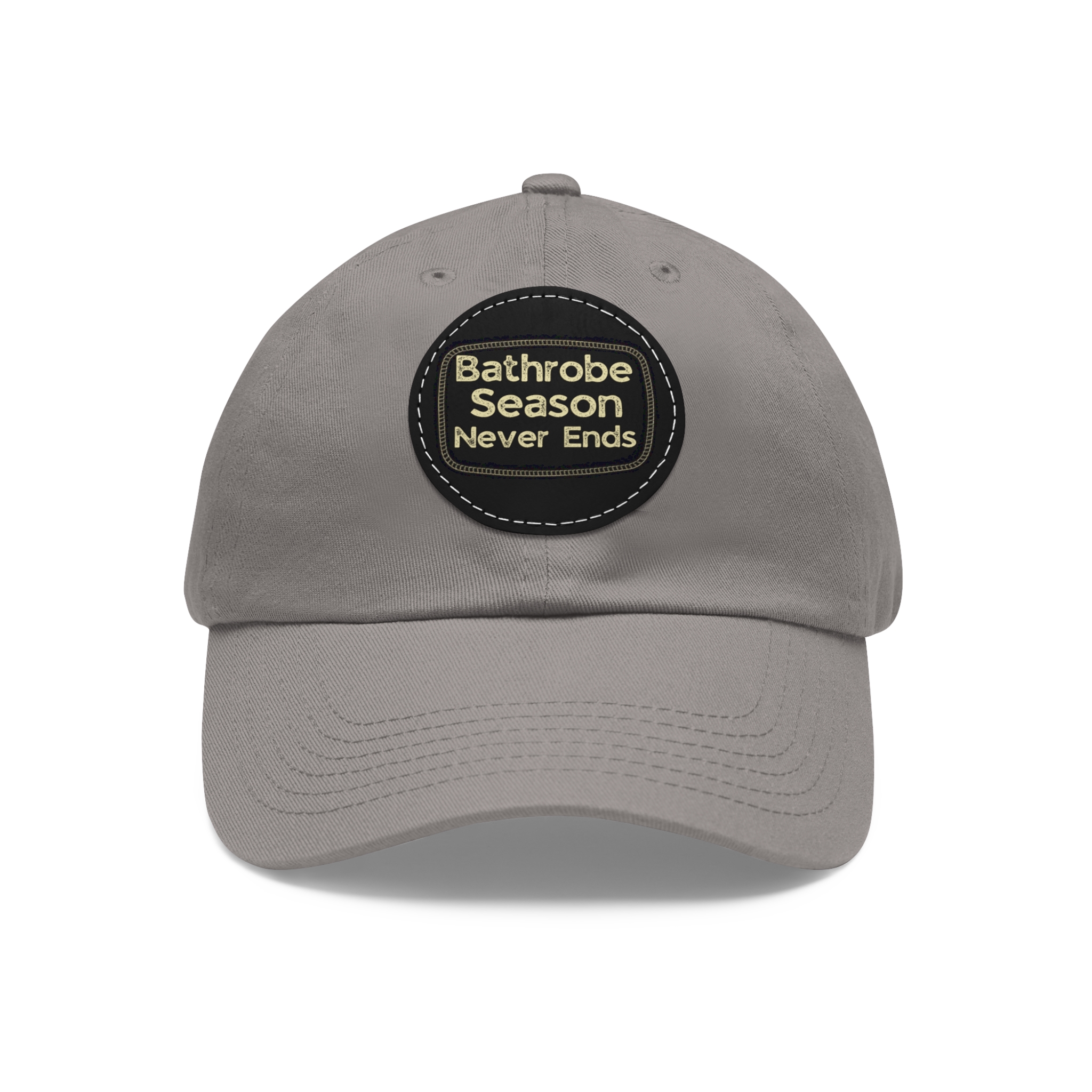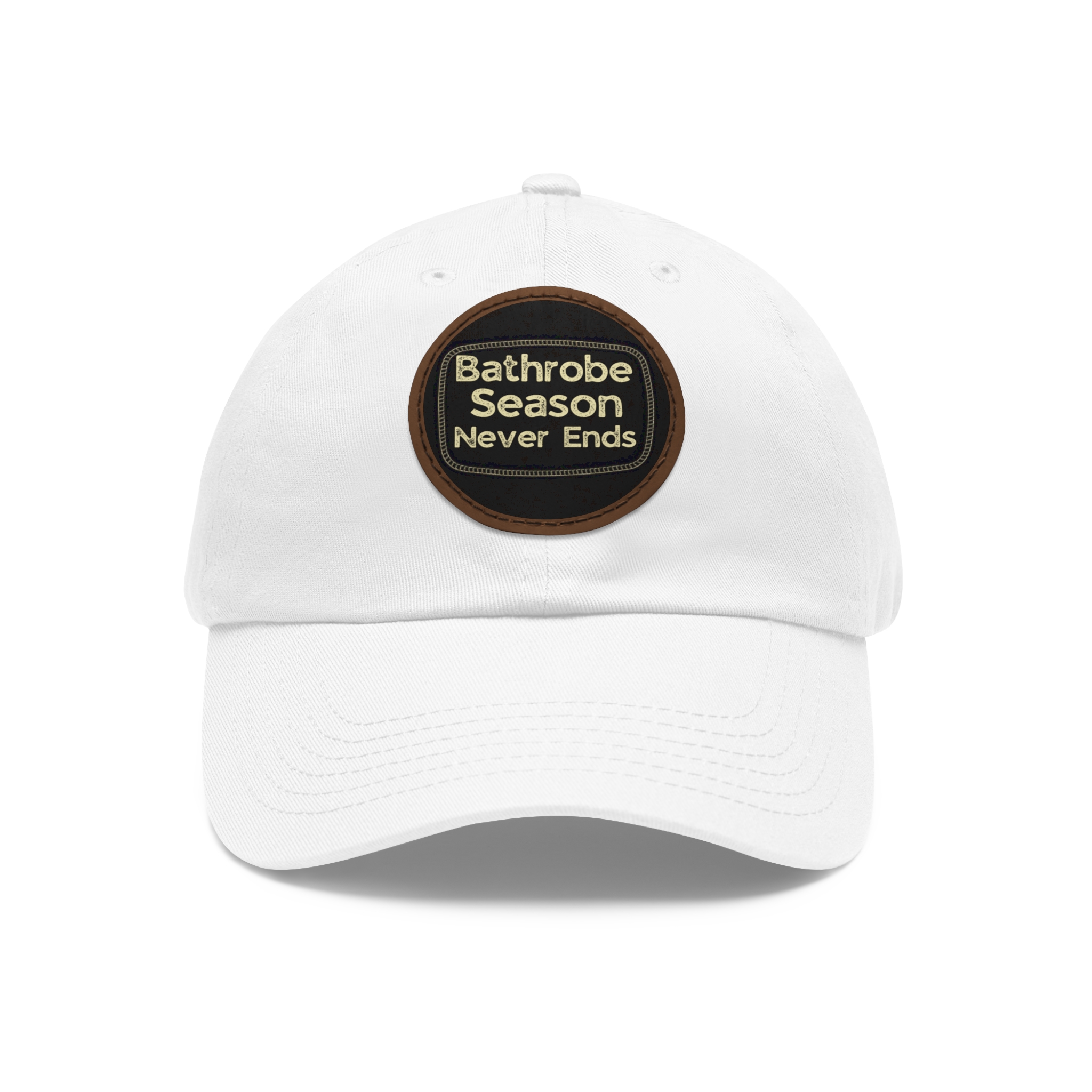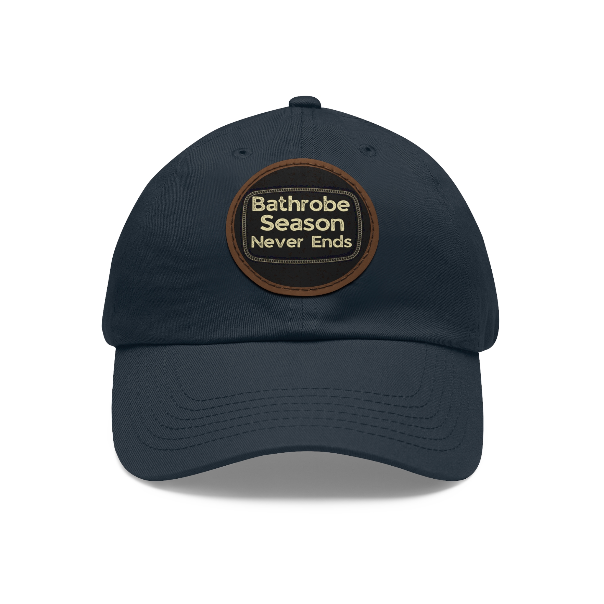 A low-profile dad hat with a vintage leather-look patch that quietly announces your love for cozy mornings: “Bathrobe Season Never Ends.” Soft bio-washed chino twill shapes a relaxed silhouette that breaks in rather than wears out. Antique-brass buckle and decorative stitching around the round PU leather patch add an old-school, handcrafted feel. Lightweight and pre-curved, it slips into the rhythm of slow weekends, chilly porches, and coffee-steam mornings. Hand-wash care keeps the patch looking sharp while the vegan leather ages gracefully alongside your favorite robe and slippers.