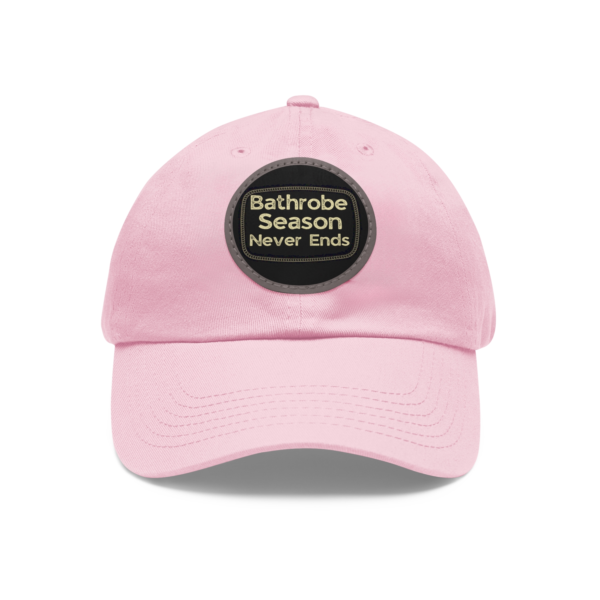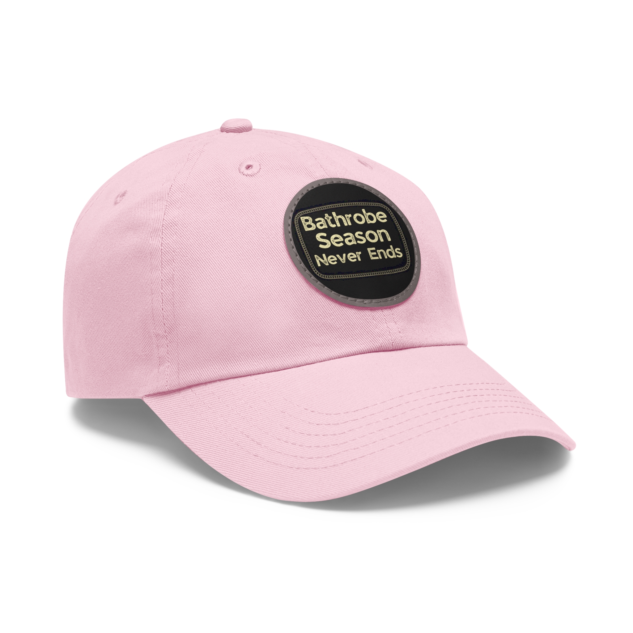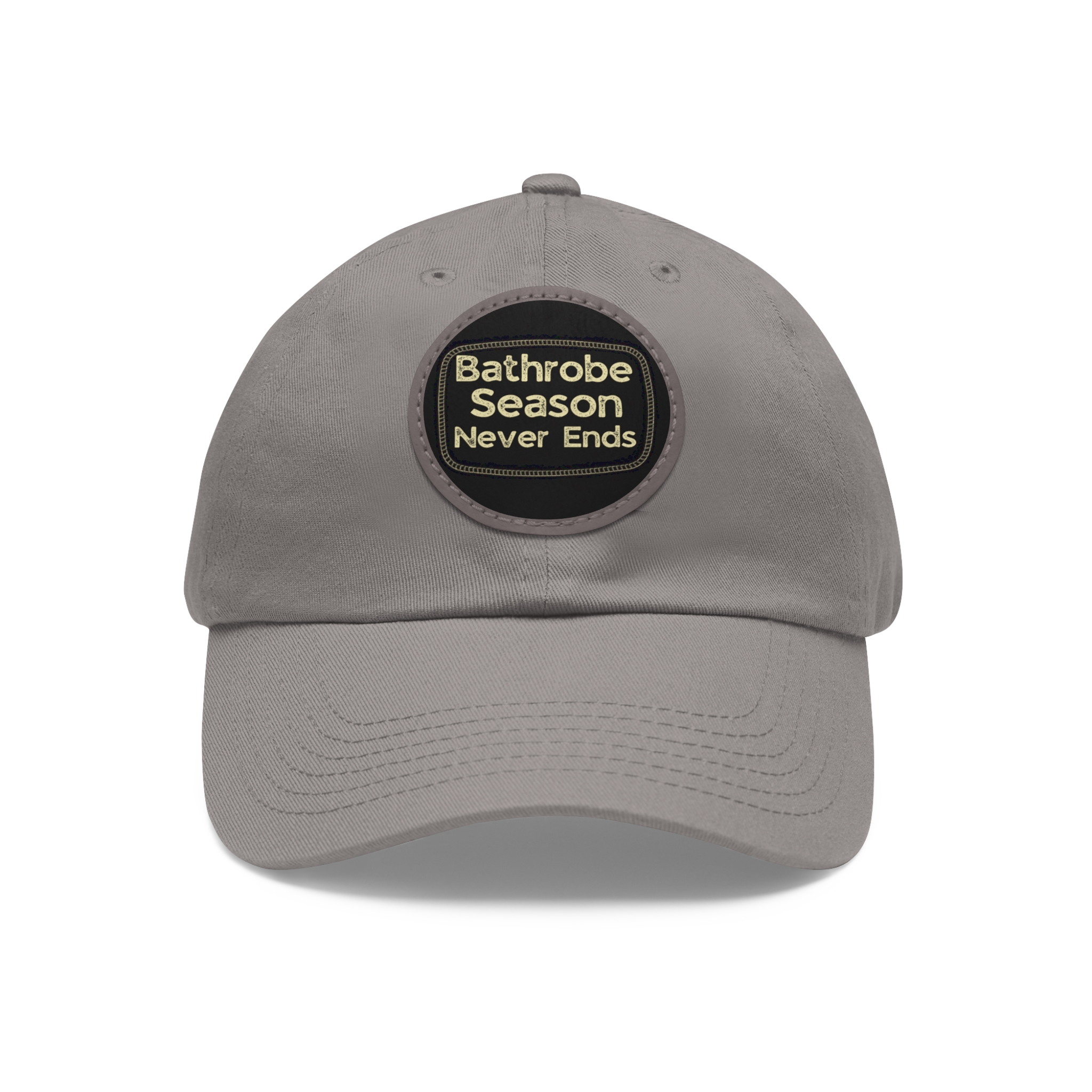 A low-profile dad hat with a vintage leather-look patch that quietly announces your love for cozy mornings: “Bathrobe Season Never Ends.” Soft bio-washed chino twill shapes a relaxed silhouette that breaks in rather than wears out. Antique-brass buckle and decorative stitching around the round PU leather patch add an old-school, handcrafted feel. Lightweight and pre-curved, it slips into the rhythm of slow weekends, chilly porches, and coffee-steam mornings. Hand-wash care keeps the patch looking sharp while the vegan leather ages gracefully alongside your favorite robe and slippers.