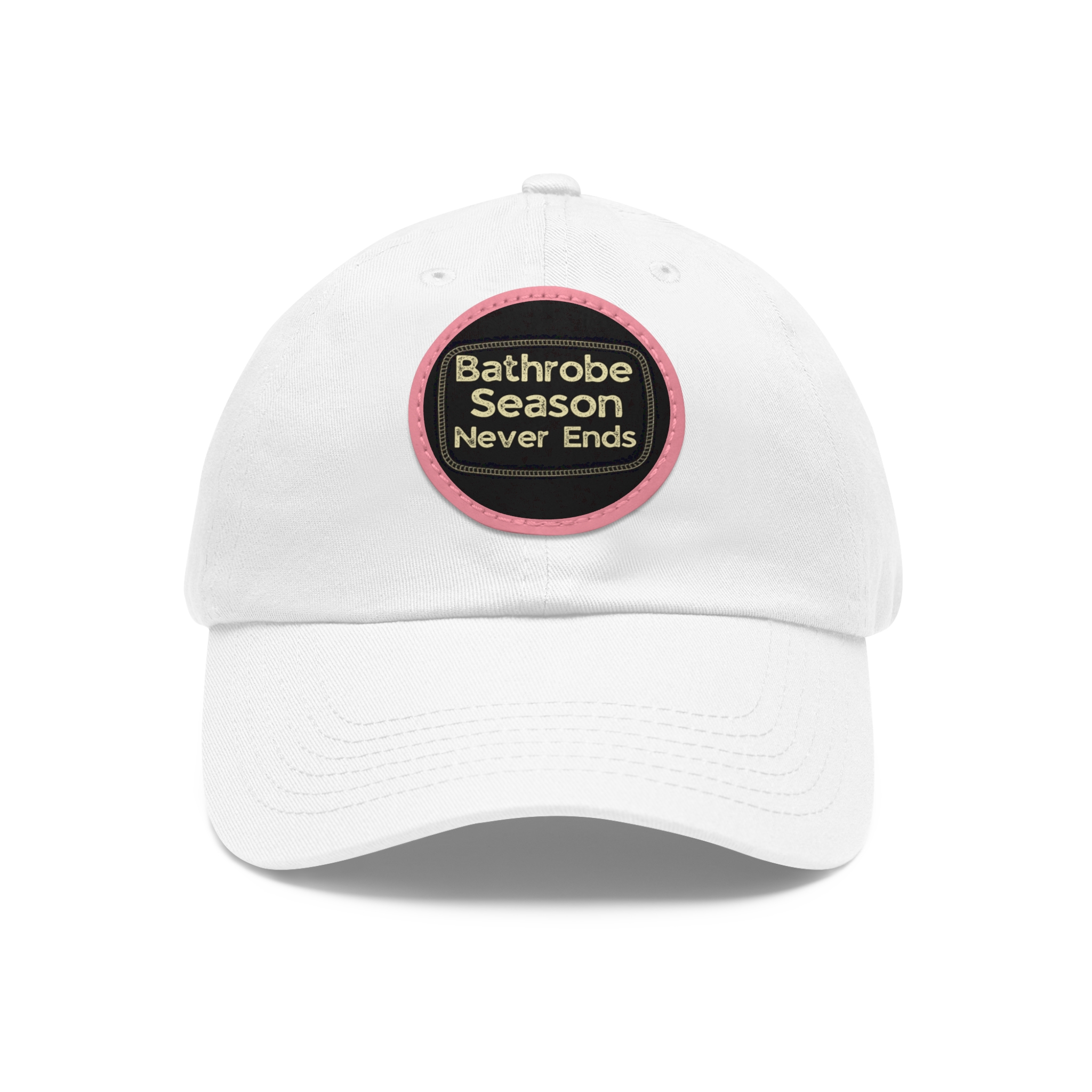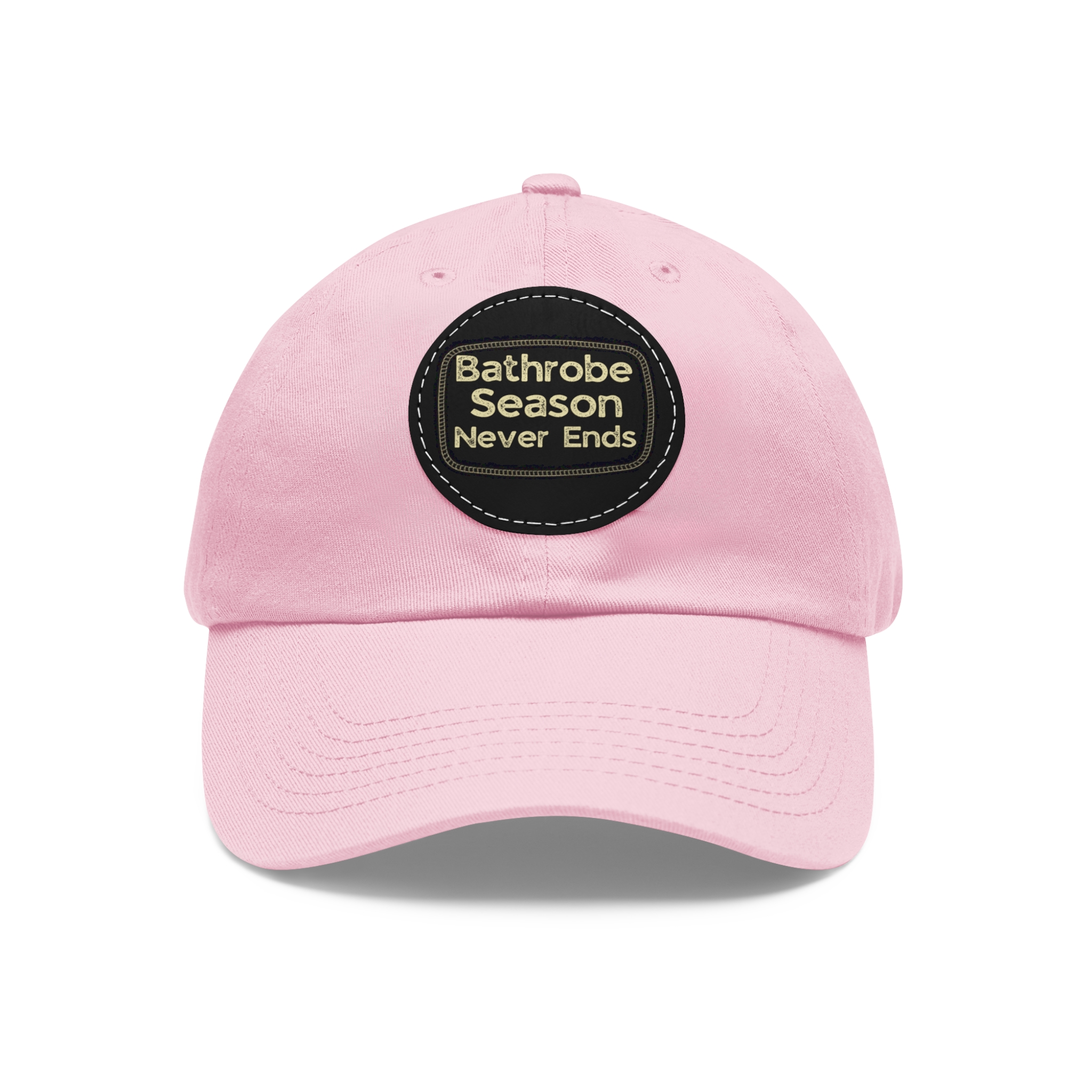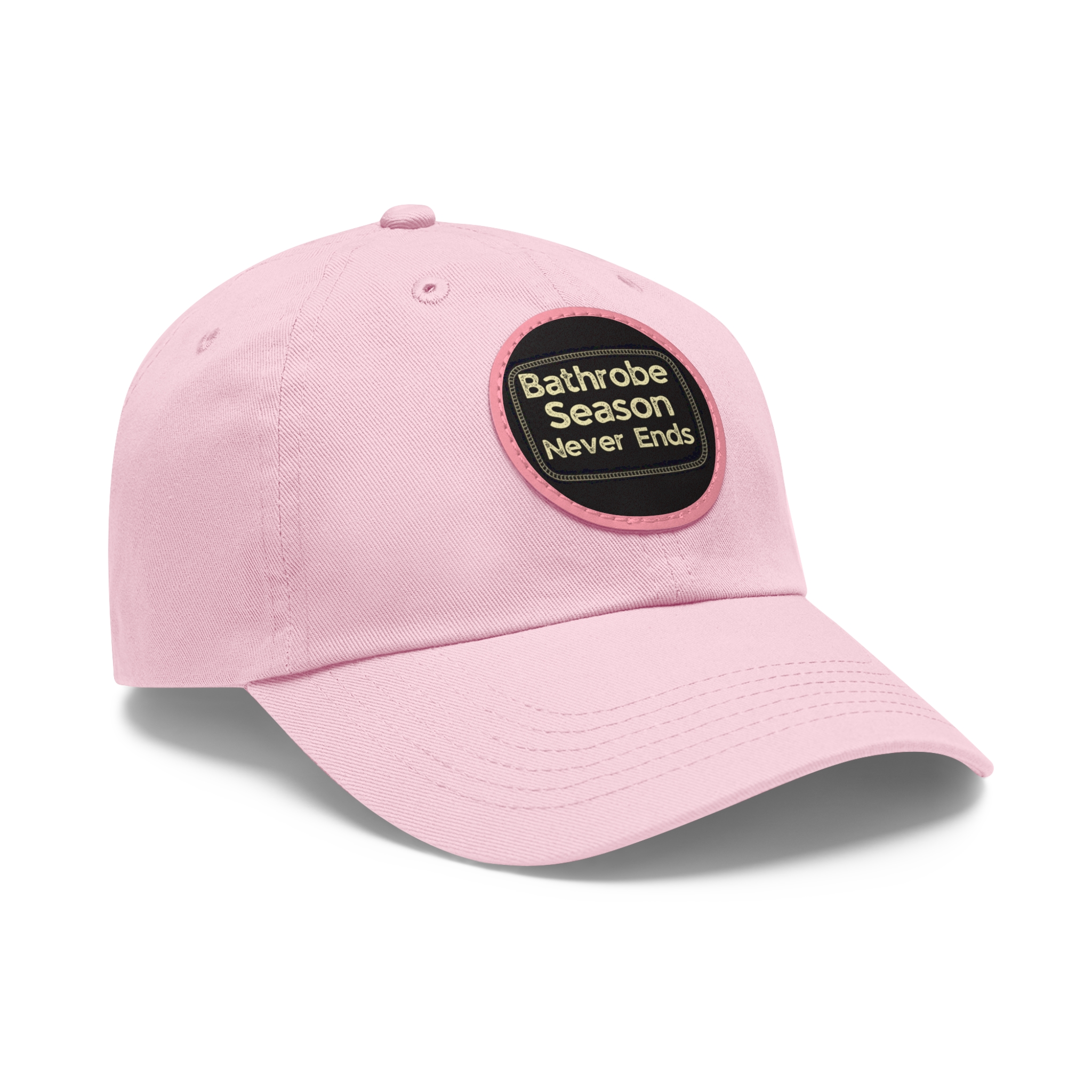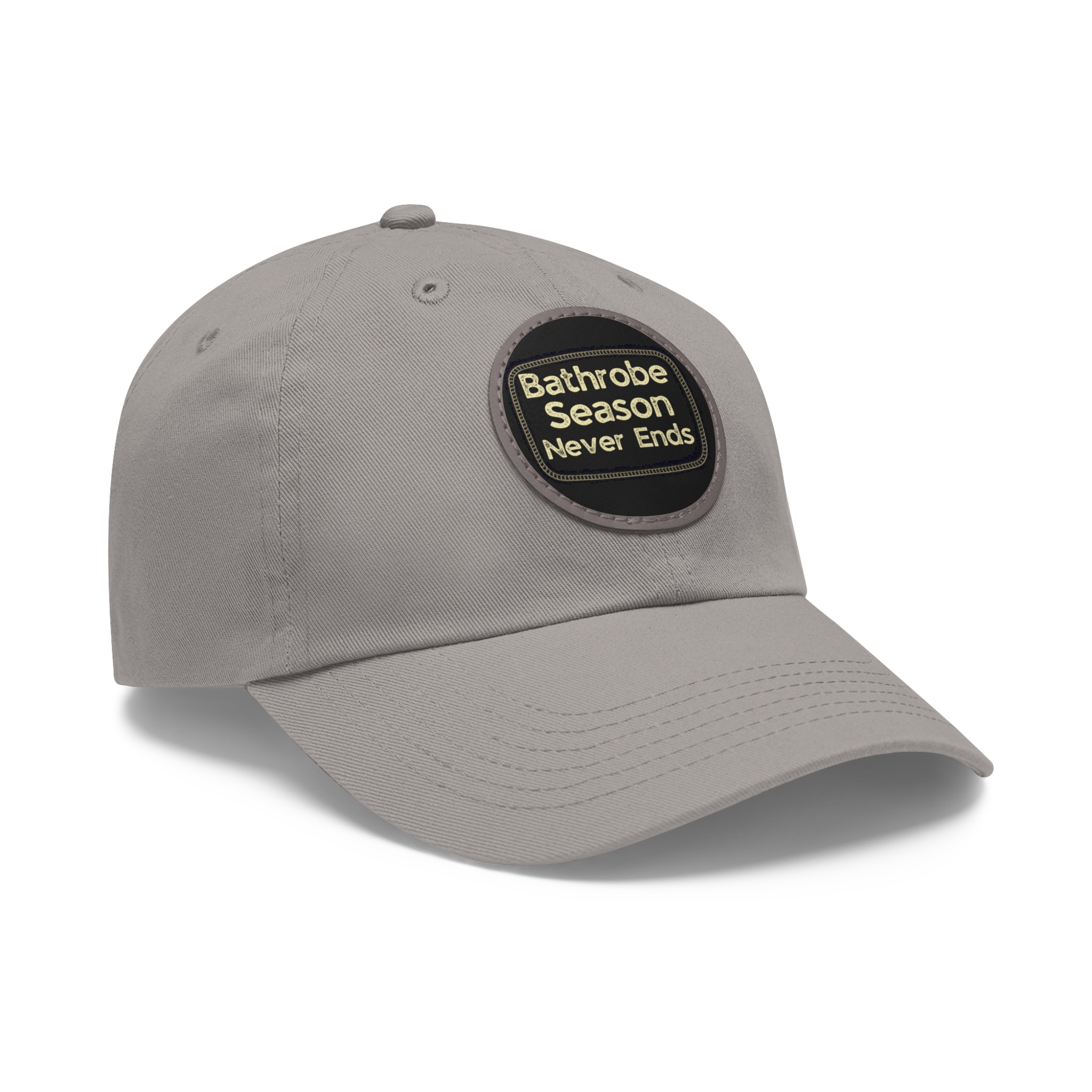 A low-profile dad hat with a vintage leather-look patch that quietly announces your love for cozy mornings: “Bathrobe Season Never Ends.” Soft bio-washed chino twill shapes a relaxed silhouette that breaks in rather than wears out. Antique-brass buckle and decorative stitching around the round PU leather patch add an old-school, handcrafted feel. Lightweight and pre-curved, it slips into the rhythm of slow weekends, chilly porches, and coffee-steam mornings. Hand-wash care keeps the patch looking sharp while the vegan leather ages gracefully alongside your favorite robe and slippers.