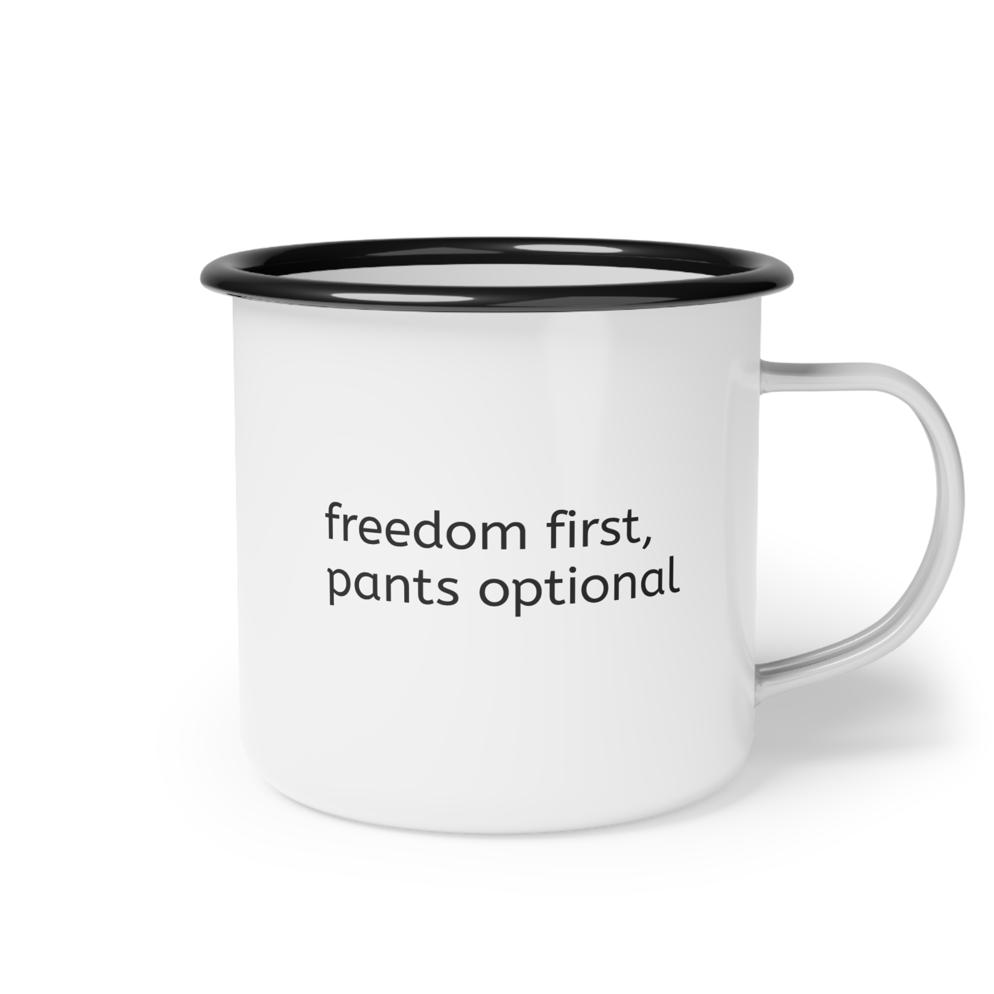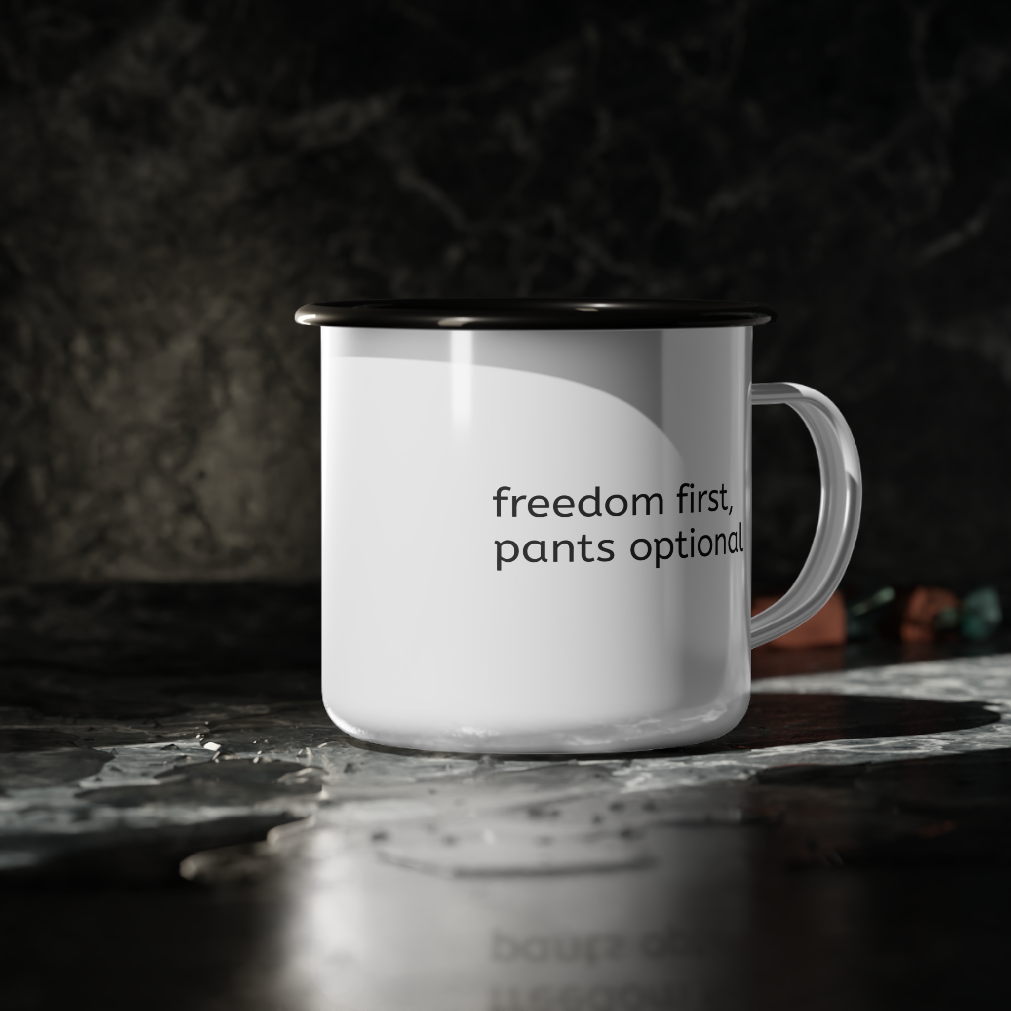 This enamel camp cup brings a quiet, rugged energy to your morning ritual. Clean white enamel with a glossy black rim and a striking monochrome hooded-figure wrapped in a star-spangled pattern creates a bold, slightly mysterious look. It feels right at home beside a campfire, on a back-porch table, or tucked into a daypack for a roadside stop. Lightweight and tough, it warms your hands and settles into everyday use — whether you’re nursing strong coffee before a sunrise hike or sharing stories around embers at dusk. The simple, almost icon-like artwork gives the cup an urban-outdoors edge that appeals to people who move between city streets and wild trails. Practical details — like dishwasher-safe enamel, acid- and alkali-resistant glaze, and a BPA/lead-free finish — mean this cup won’t shy away from real-life messes. Just don’t microwave it. Bring it along to camping trips, fall get-togethers, or quiet mornings when you want something with character and grit.
