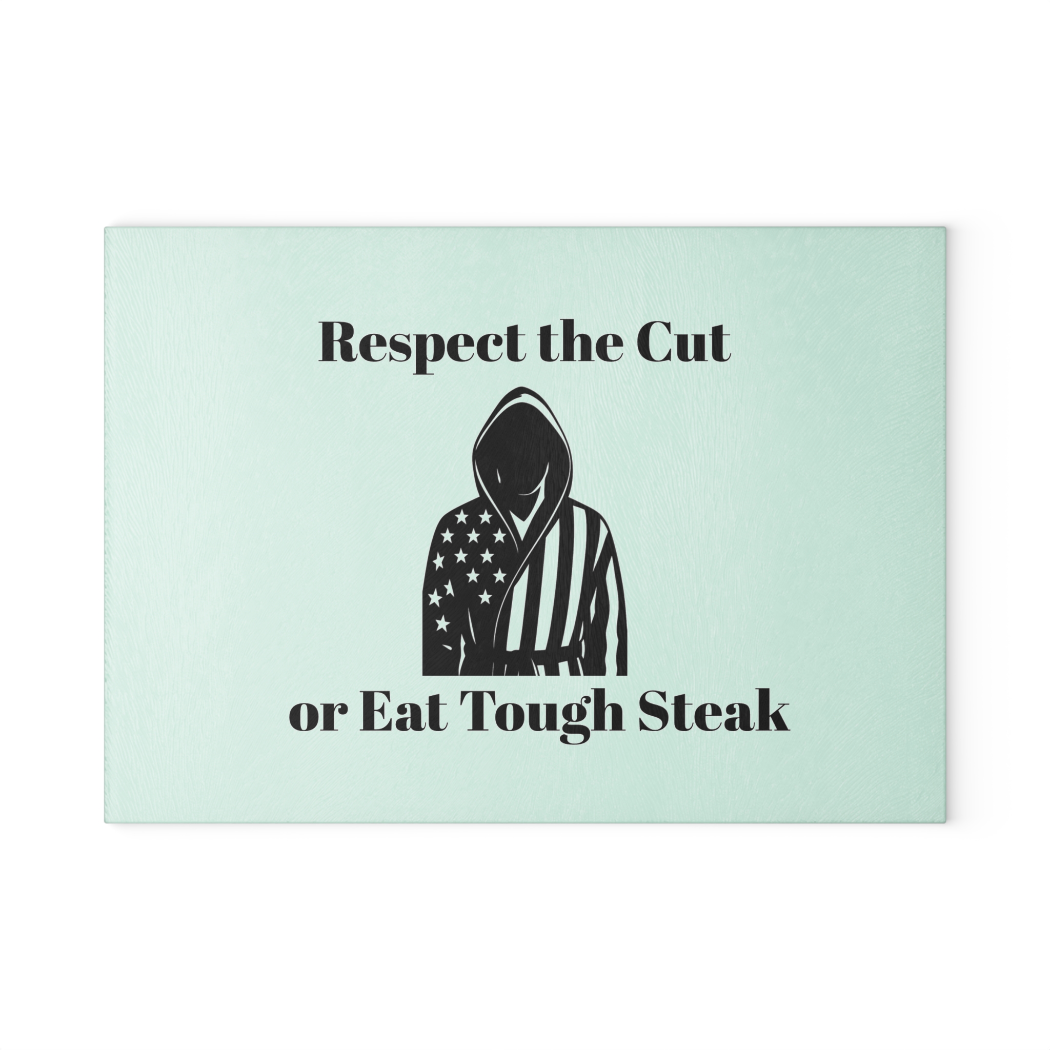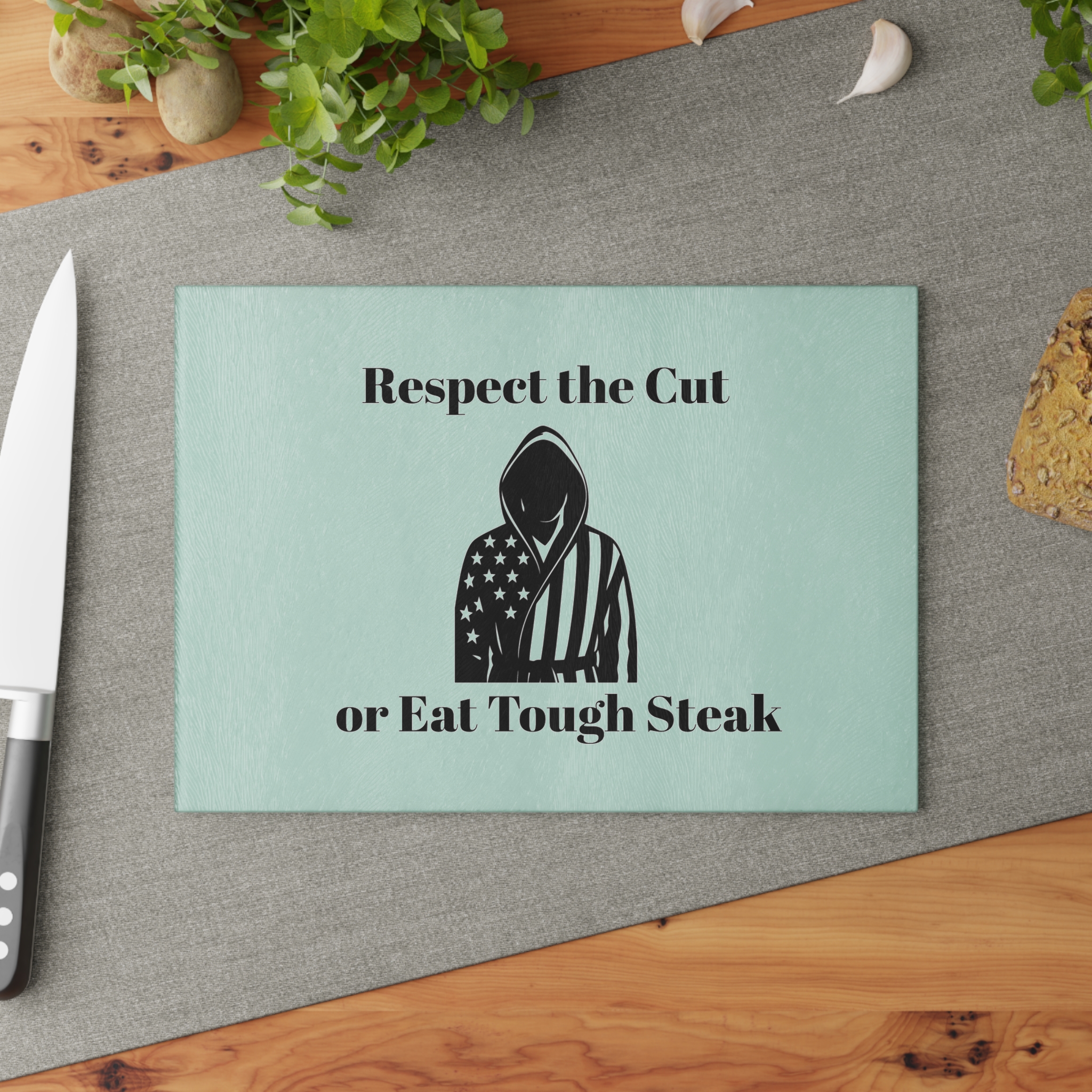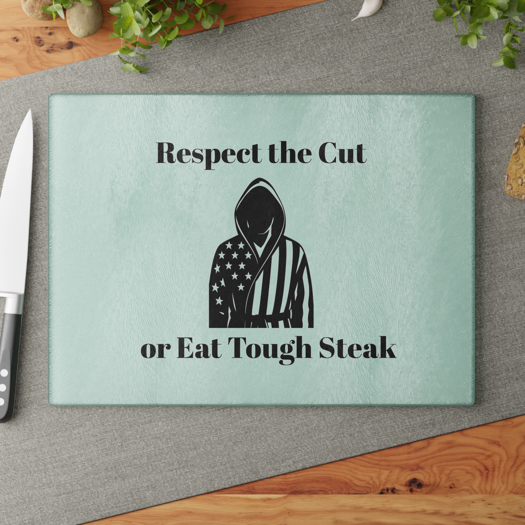 Glass Cutting Board – “Respect the Cut or Eat Tough Steak” Patriotic Chef Kitchen Decor