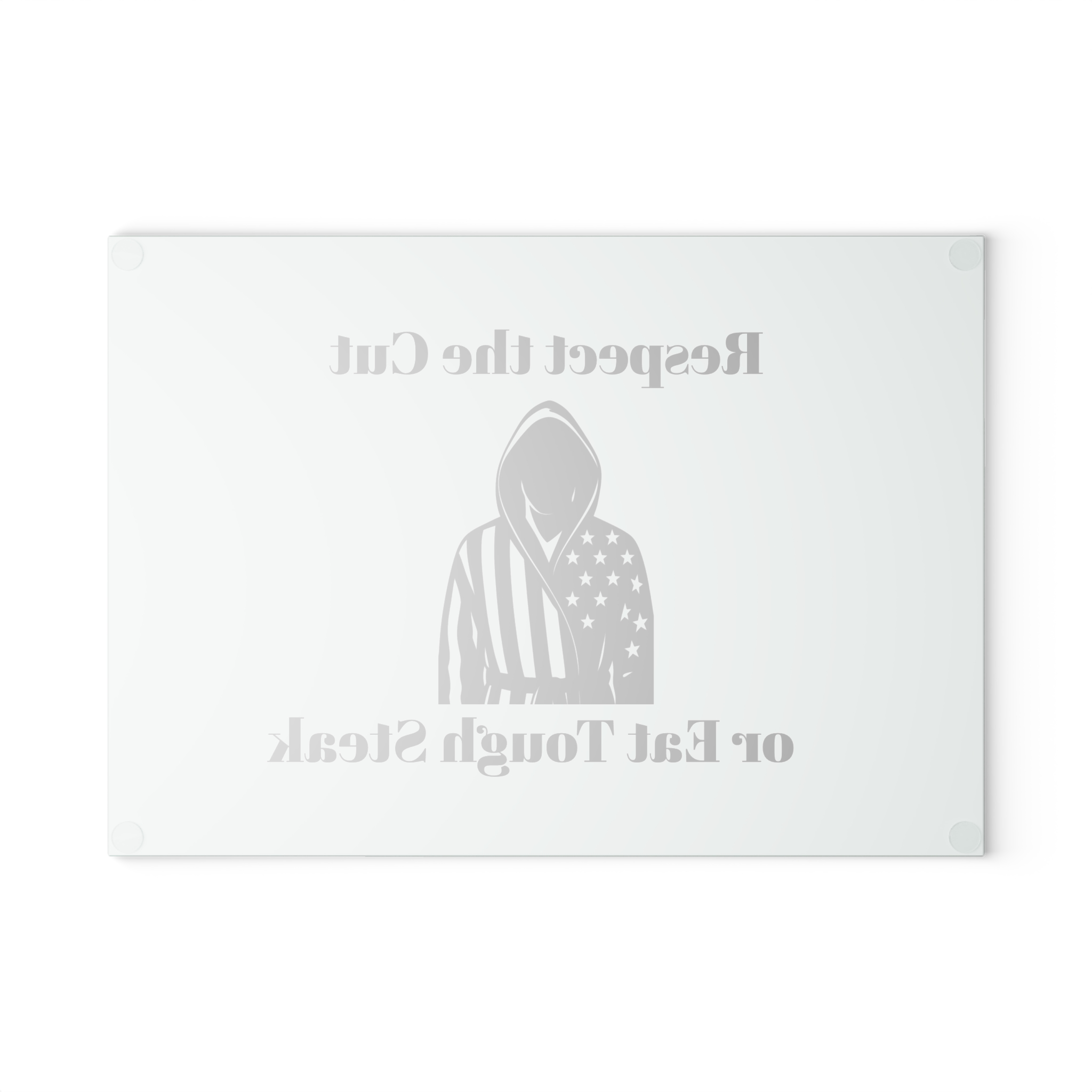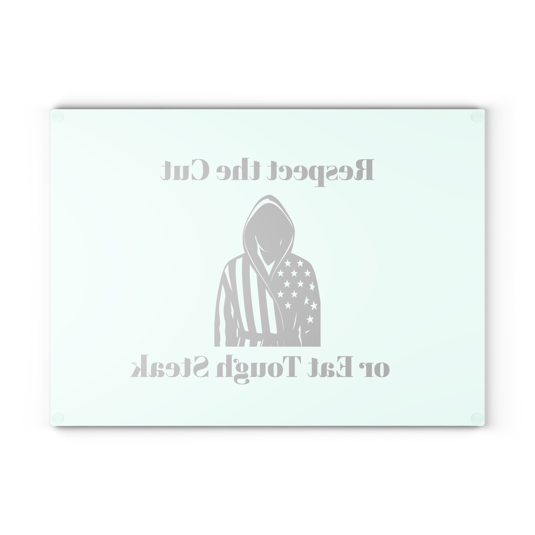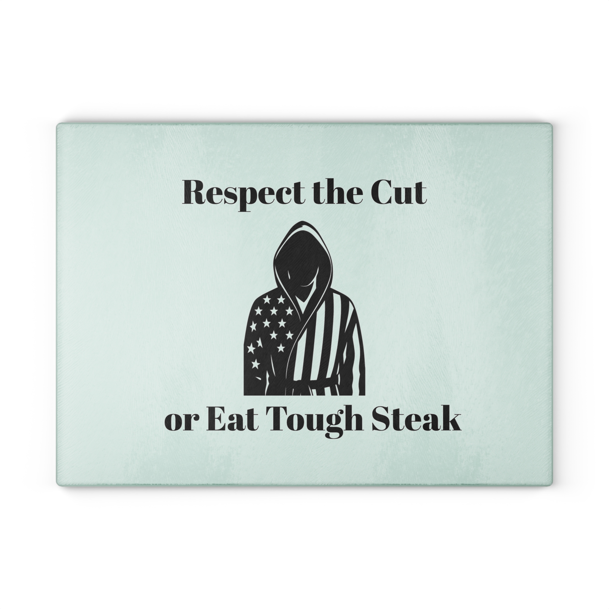 Glass Cutting Board – “Respect the Cut or Eat Tough Steak” Patriotic Chef Kitchen Decor